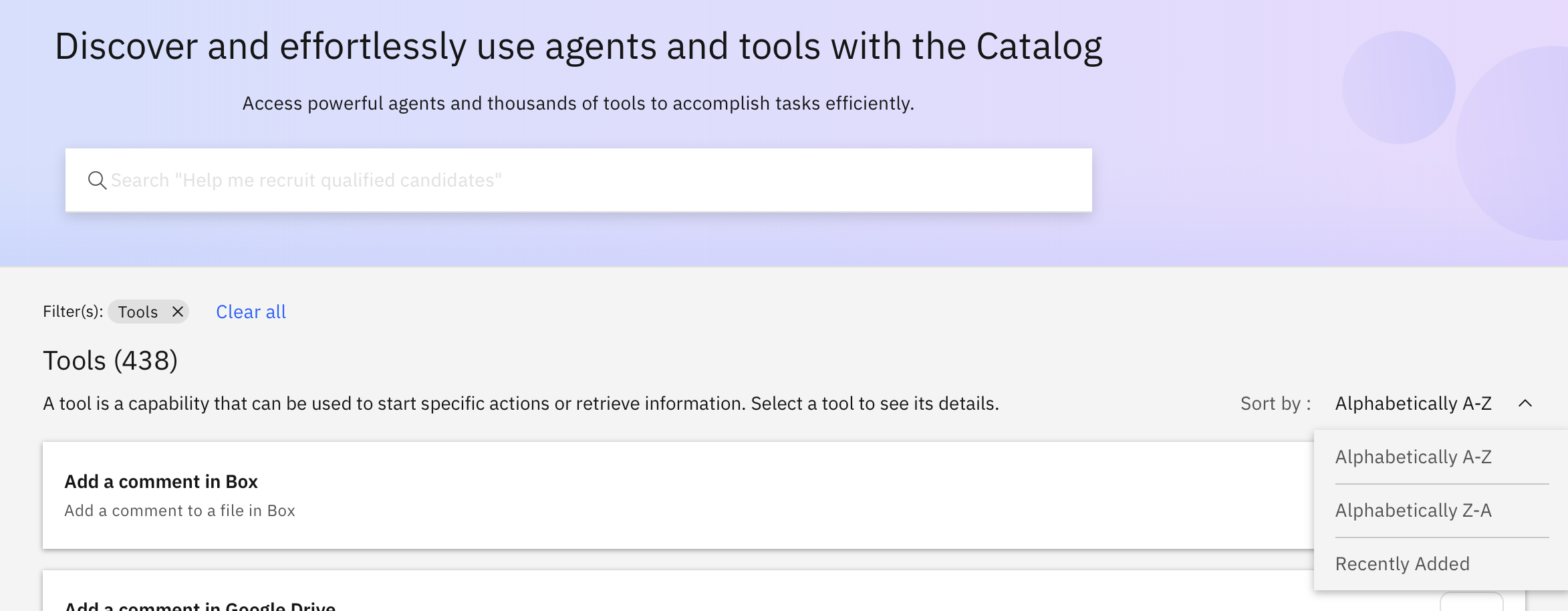 considering this for the agent/tool catalog which does provide sorting per alphabetical order and added date (only in IBM public catalog/view for tools) and a strong search feature but not the filters mentioned we are considering as upcoming improvements.